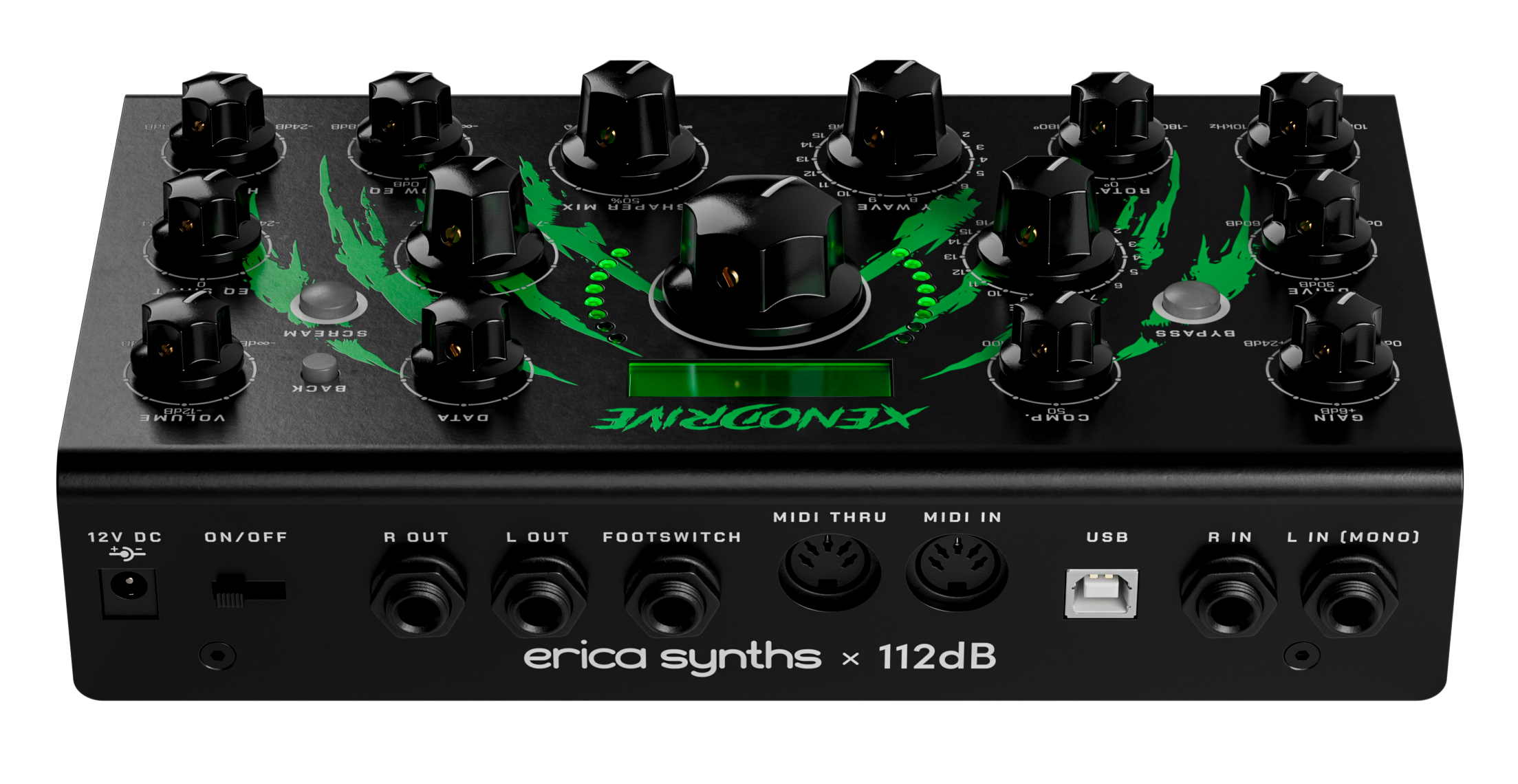 A unique stereo distortion/overdrive/waveshaper FX unit with an algorithm developed by 112db and Erica Synths, the Xenodrive is a hands-on tool for shaping your sounds in the studio or during live shows – from nuanced harmonic enhancement to total sonic destruction. Featuring 12 parameters for detailed sound design, save/recall functions for all parameters, MIDI control over all parameters and a sleek aluminium case to match our lineup of compact desktop units, the Xenodrive will elevate your sound in any live show, studio or sonic experiment.