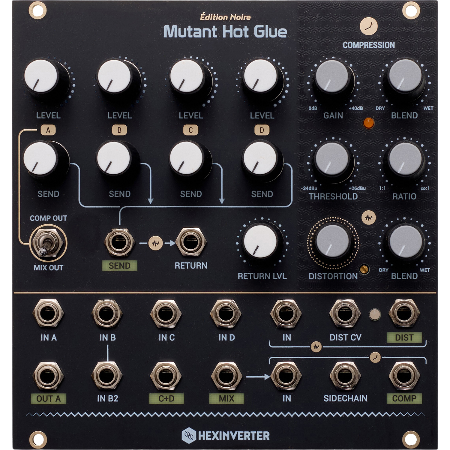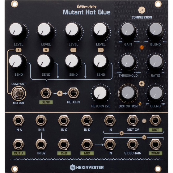 By default, the 4 channel mixer’s output conveniently feeds into the compressor’s input, giving access to easy New York style parallel compression by way of the compressor blend control. The dedicated output and mixer bypass switch for channel A allow you to use it as a sidechain source for the compressor. An effects send and return allow you to create complex effects routings within your modular system. With the number of excellent DSP and other effects modules on the market today, this makes it easy to combine modules to great effect, all within the eurorack modular domain.