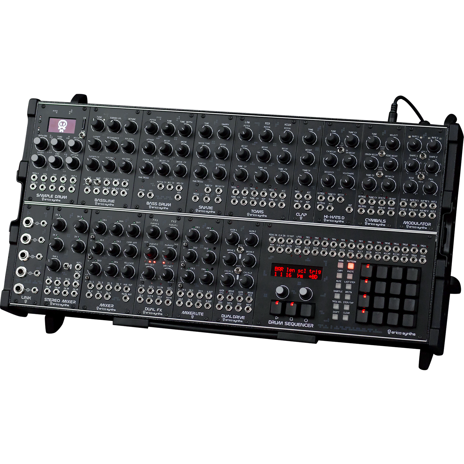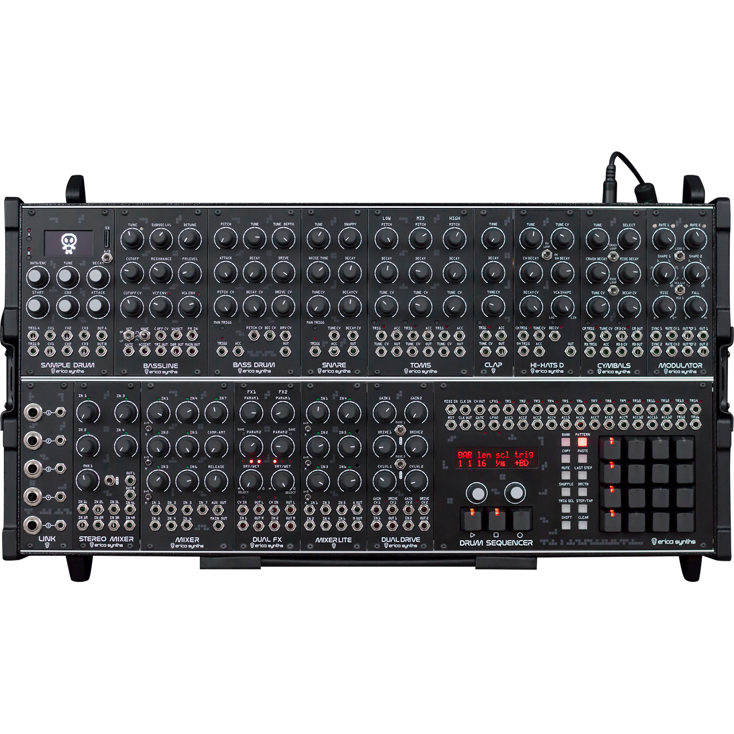 Techno System comes in Erica Synths Travel Case (universal PSU and case lid included) and with 25 black patch cables.