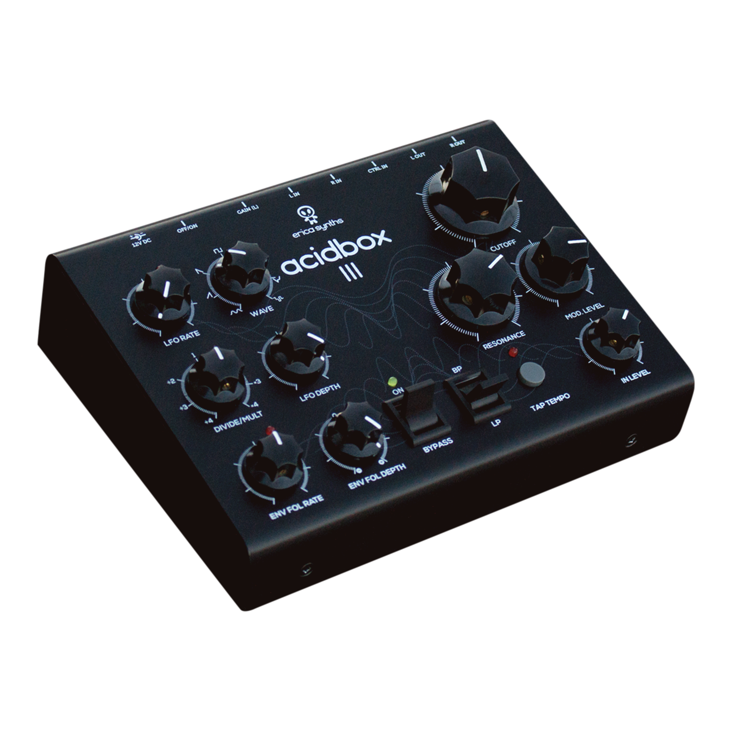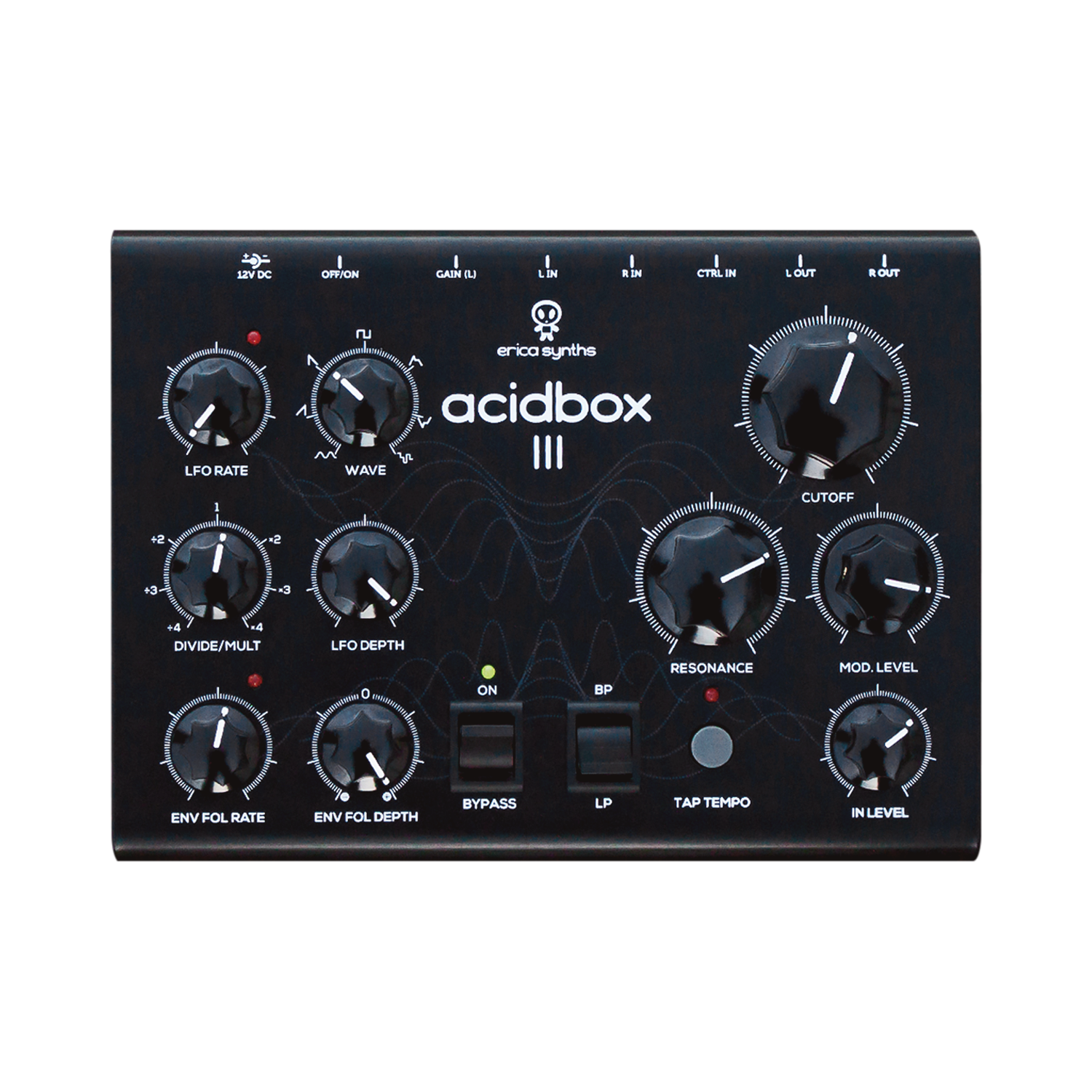 The Acidbox III has adjustable input gain, therefore it works with various sound sources – guitars, units with line level signals (synthesizers, grooveboxes, etc.) and modular synths. Configurable control input allows you to connect a bypass footswitch, expression pedal, external cutoff control voltage source and LFO synchronization trigger. This makes the Acidbox an ideal companion in almost every production or live performance setup.