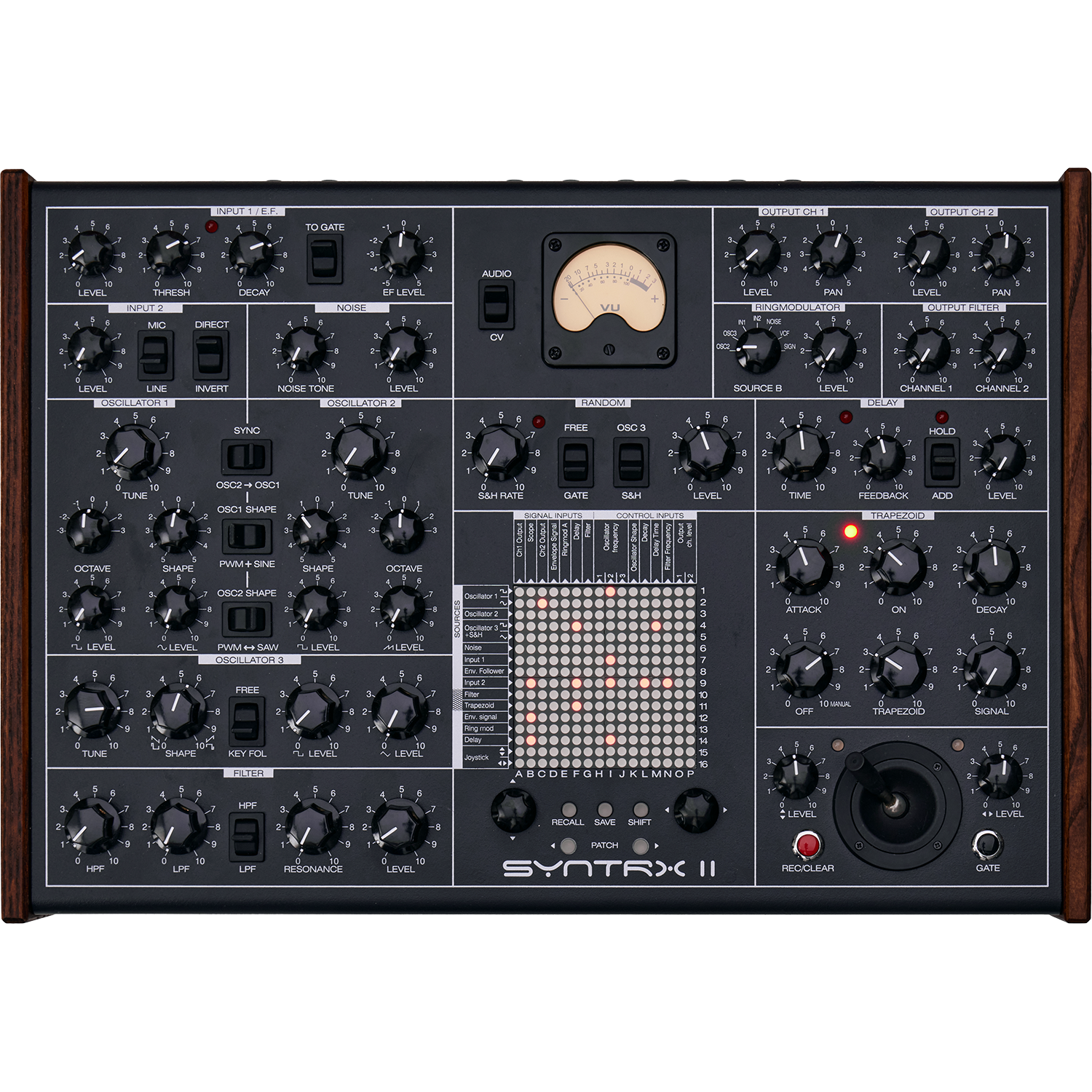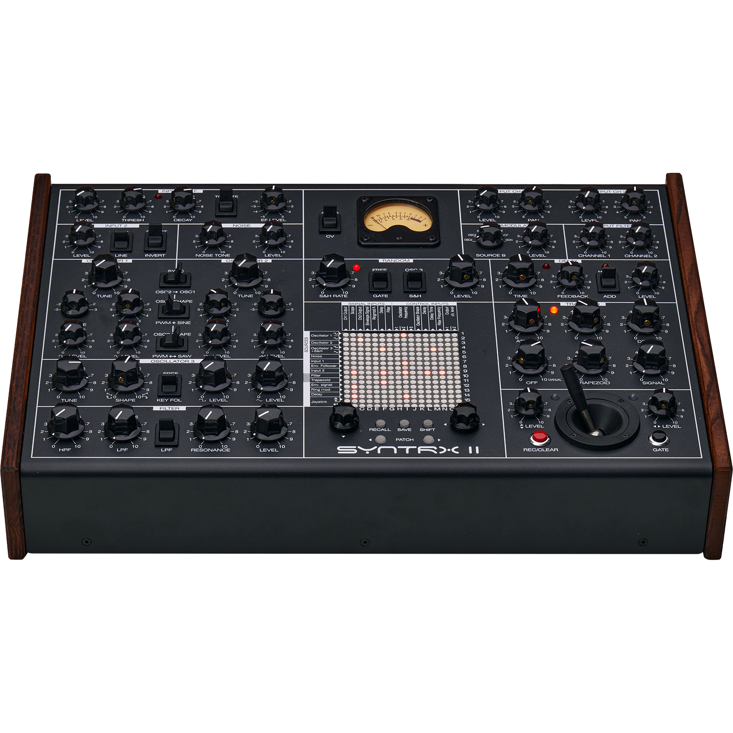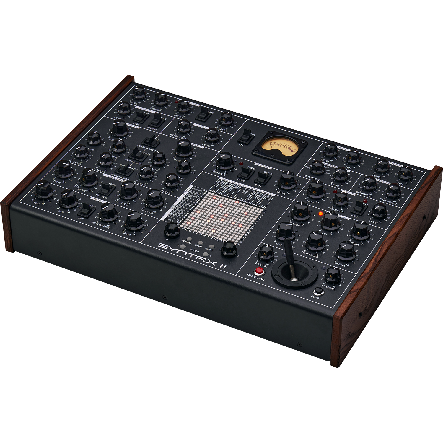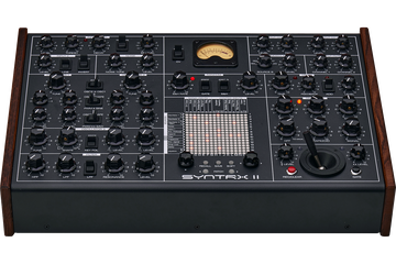 The SYNTRX II is the culmination of our analogue sound design circuits – two perfectly stable main oscillators with waveshapers, a modulation oscillator with 1V/oct tracking, a versatile multimode filter, supercharged external instrument inputs with an envelope follower, a unique, great-sounding ring modulator, a recordable joystick, built-in piano roll sequencer and stepped modulation sources, all arranged around our signature matrix mixer and topped off with powerful FX on our new DSP platform.
